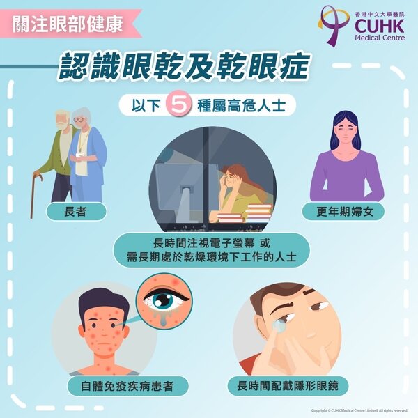 乾眼症是一種容易被忽視的眼病,除了眼睛經常因乾澀不適而直接影響到日常生活及心理困擾外;還會影響視力,更有機會發展為角膜病變,甚至失明。若你屬於以下 5 種高危人士之一,便適宜定期進行眼睛健康檢查,盡早知道自己是否患有乾眼症並進行合適的治療。