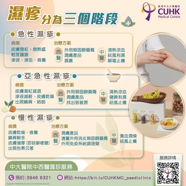 濕疹是常見的炎症性皮膚病,大致可分為急性濕疹、亞急性濕疹和慢性濕疹,三個階段可互相轉化及影響。在治療方案上,西醫的用藥以外用消炎藥膏為主,中醫則採用內服的中藥,兩者各擔當不同的角色,若配合得宜便能相得益彰,達到內外兼治的效果。