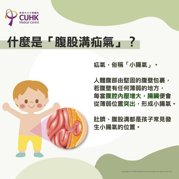 疝氣,俗稱「小腸氣」,是常見的小兒外科問題之一。人體的腹部在四方八面都由堅固的腹壁包裹形成,若腹壁有任何薄弱的地方,每當腹腔內壓增大,腸臟便會從薄弱位置突出,形成小腸氣。而肚臍、腹股溝都是孩子常見發生小腸氣的位置。