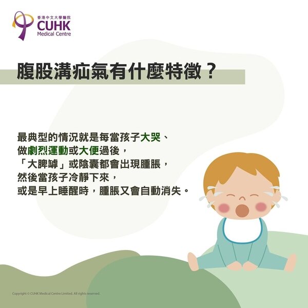 最典型的情況是每當孩子大哭、做劇烈運動、或大便過後,「大脾罅」或陰囊都會呈現腫脹,然後孩子冷靜下來、或是早上睡醒時,腫脹又會自動消失,便很大機會是患上腹股溝疝氣,建議早日求診。雖然較常見於男孩子,但在女孩子身上也可以出現,不過腫脹的地方會於大陰唇止步。