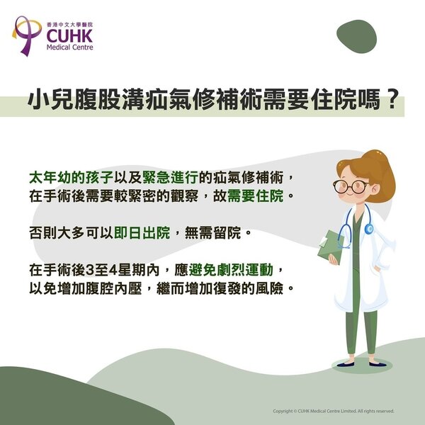 一般來說,太年幼的孩子以及急症進行的疝氣修補術在術後需要較緊密的觀察,故需要住院。否則大多可以即日出院,無需留醫。