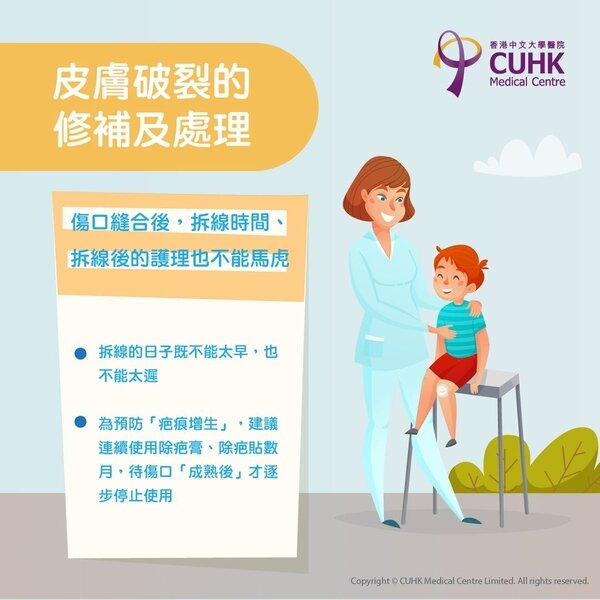 傷口縫合後,拆線的時間、拆線後的護理也不能馬虎。拆線的日子既不能太早,也不能太遲。而要對付「疤痕增生」,更是預防勝於治療。在傷口癒合後,一般建議要有恆心地連續使用除疤膏、除疤貼數月,待傷口「成熟後」才逐步停止使用。