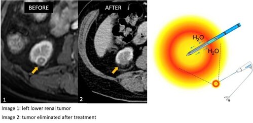 Cryoablation utilises argon-helium gas and the Joule Thomson effect to produce freezing and thawing effects within the tumor, hence killing tumor cells.