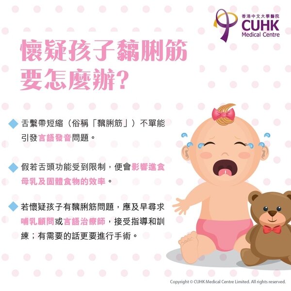 其实,黐脷筋能引发的问题并不单单在于言语发音。「母乳宝宝」吸啜乳房、半岁孩子开始进食固体食物,都牵涉正常的舌头动作。假若舌头功能受到限制,便会影响进食母乳及固体食物的效率。故此,若家长怀疑孩子有黐脷筋的问题,应及早寻求哺乳顾问或言语治疗师的帮忙,接受指导和训练;有需要的话更要进行手术。