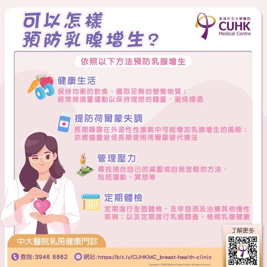 定期進行全面體檢,及早發現及治療其他慢性疾病,如糖尿病、高血壓等維持整體健康狀況,對乳腺健康亦有幫助。以及定期進行乳癌篩查,例如乳房超聲波及X光造影等,檢視乳腺健康。