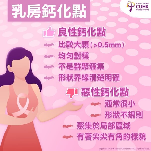 乳房裡每一種組織都會有機會鈣化,例如皮膚、血管、脂肪、乳管等。而良性鈣化點的特徵包括;比較大顆(>0.5mm)、不是群聚簇集、均勻對稱、形狀界線清楚明確。良性鈣化點不會變惡性,只要定期跟進便可。