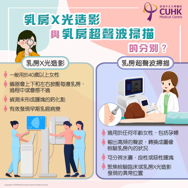 乳房X光造影(Mammogram)與超聲波掃描(Ultrasound scan)雖然皆為乳房影像檢查常用的方法,但它們各有自己的功效和角色
