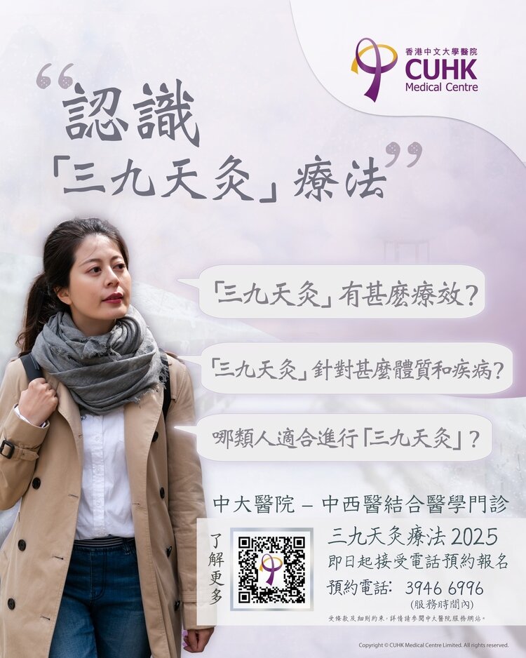 💬為推廣這一傳統療法,香港中文大學醫院中西醫結合醫學門診將舉辦冬季天灸活動。我們的專業中醫團隊將根據您的個人體質,精準選穴貼敷,為您驅散冬日寒氣,增強抗病能力。誠邀您與我們一起順應天時,為自己的儲備能量,健康過冬。