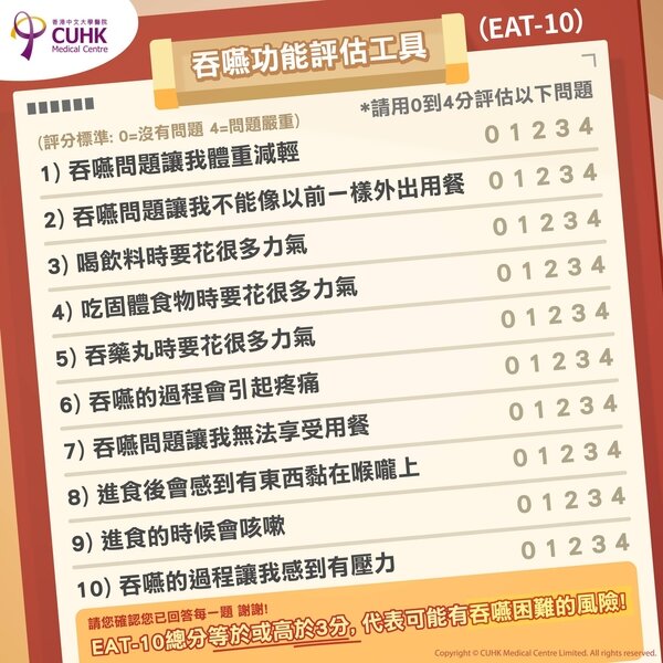 長者如年事已高,或腦部曾經受過創傷,又或有相關疾病,如認知障礙症、中風、柏金遜等。也會較容易出現吞嚥困難。如果情況嚴重,沒有適切的治療方案,除了容易嗆到引致吸入性肺炎,更有機會造成哽塞窒息而死亡,十分危險。 利用「吞嚥功能評估工具表 (EAT-10)」,透過簡單10題問題,0-4分的評分方法,以最簡易的方式初步評估,及早發現吞嚥困難的問題,進一步尋求言語治療師或醫生的協助及治療。