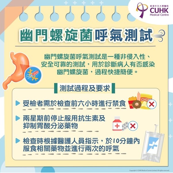 幽門螺旋菌呼氣測試是用於診斷病人有否感染幽門螺旋菌的常用測試,是一種非侵入性、準確性高、安全可靠的測試,過程快捷簡便;此測試亦適合於服用除菌療程後的跟進檢查。測試過程及要求: - 受檢者需於檢查前六小時進行禁食 - 兩星期前停止服用抗生素及抑制胃酸分泌藥物 - 檢查時根據醫護人員的指示,於10分鐘內服食相關藥物並進行兩次的呼氣 (注意:曾進行胃部手術人士並不適合作出幽門螺旋菌呼氣測試。)