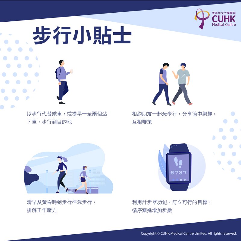 步行是最簡單、最安全的運動,也是最有效促進健康的運動之一。即使您忙得抽不出時間做運動,也可每天急步行最少十五至二十分鐘。研究證實,經常急步行(在十五至二十分鐘內走1.6公里,即約大圍站步行到車公廟站的距離),並將之變成終生習慣,對身體健康有長遠的益處。