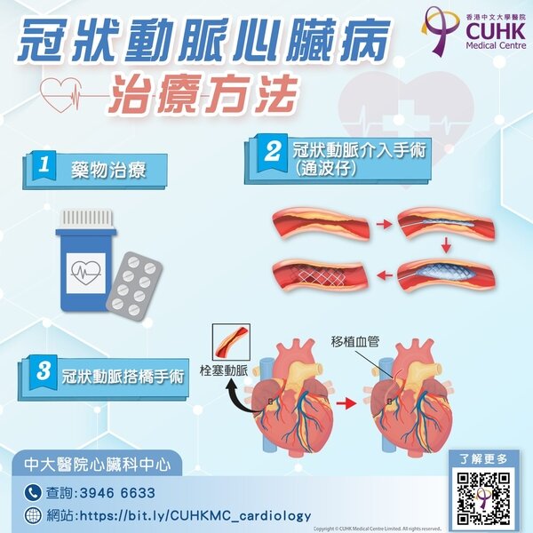 根據患者的病情嚴重程度,冠狀動脈心臟病的治療方法亦有所不同,以下是常用的治療方法: