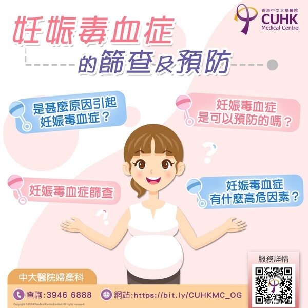 香港中文大學已建立一個新方法,結合孕婦的高危因素、血壓、子宮動脈血流與PlGF【胎盤生長因子】水平來篩查妊娠毒血症,這比單純用高危因素更有效預測妊娠毒血症,尤其是早發性妊娠毒血症。這篩查只能在懷孕11至13週之間進行,各位準媽媽請把握時機,盡早聯絡產科醫生,作產前檢查。