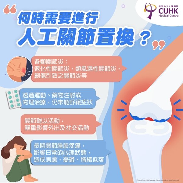 身體的關節軟骨會隨著年齡增長及每日的活動磨損而漸漸退化,而相關關節病變的機會率亦會增加。若不及早正視問題,關節問題有機會會嚴重影響病人的日常生活質素,當寸步難行時,便有需要接受關節置換手術,藉以更換受損、磨蝕或已病變的關節,有助恢復正常活動。