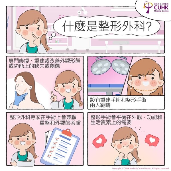 很多人對「整形外科」的印象,就是集中處理有關美觀的手術,其實此類手術只佔當中的一部分,而重建手術亦是整形外科的重點。整形外科專門修復、重建或改善外觀形態或功能上的缺失或創傷情況,當中包括重建手術和整形手術兩大重要範疇。整形外科專家會兼顧重整和整形雙方面的考慮,照顧患者在外觀、功能和生活質素上的需要。