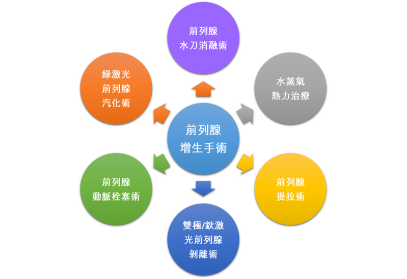 最近,前列腺增生手術取得了很多創新的發展,包括前列腺水蒸氣熱力治療(Rezum)、前列腺提拉術 (Urolift)、前列腺水刀消融術(Aquablation) 、雙極/鈥激光前列腺剝離術、綠激光前列腺汽化術和前列腺動脈栓塞術。