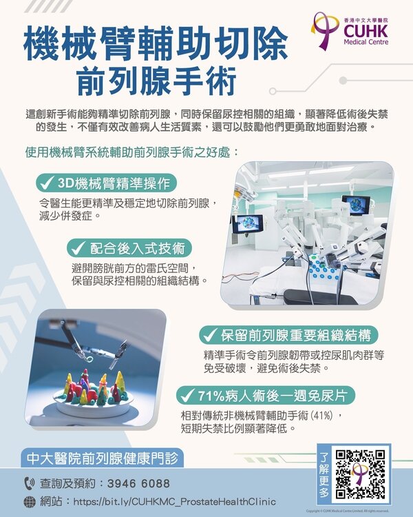 前列腺癌的根治性切除術常伴隨術後尿失禁的風險,使許多病人因此感到焦慮。隨著機械臂的發展日益發達,保留雷氏空間不受破壞的技術(Retzius-sparing technique)成為一種創新手術選擇,能夠精準切除前列腺,同時保留尿控相關的組織,顯著降低術後失禁的發生,不僅有效改善病人生活質素,還可以鼓勵他們更勇敢地面對治療。