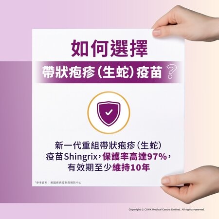 接種帶狀疱疹疫苗,可降低高達97%*的發病風險。即使不幸發病,疫苗亦能大大減輕症狀及減少併發症出現。