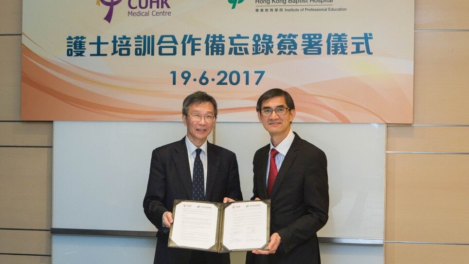 香港中文大學醫院(中大醫院)與香港浸信會醫院(浸會醫院)於今天(6月19日)簽署合作備忘錄,協議浸會醫院護士學校為中大醫院培訓登記護士,每年20個學額,為期5年,畢業生將受聘於中大醫院。